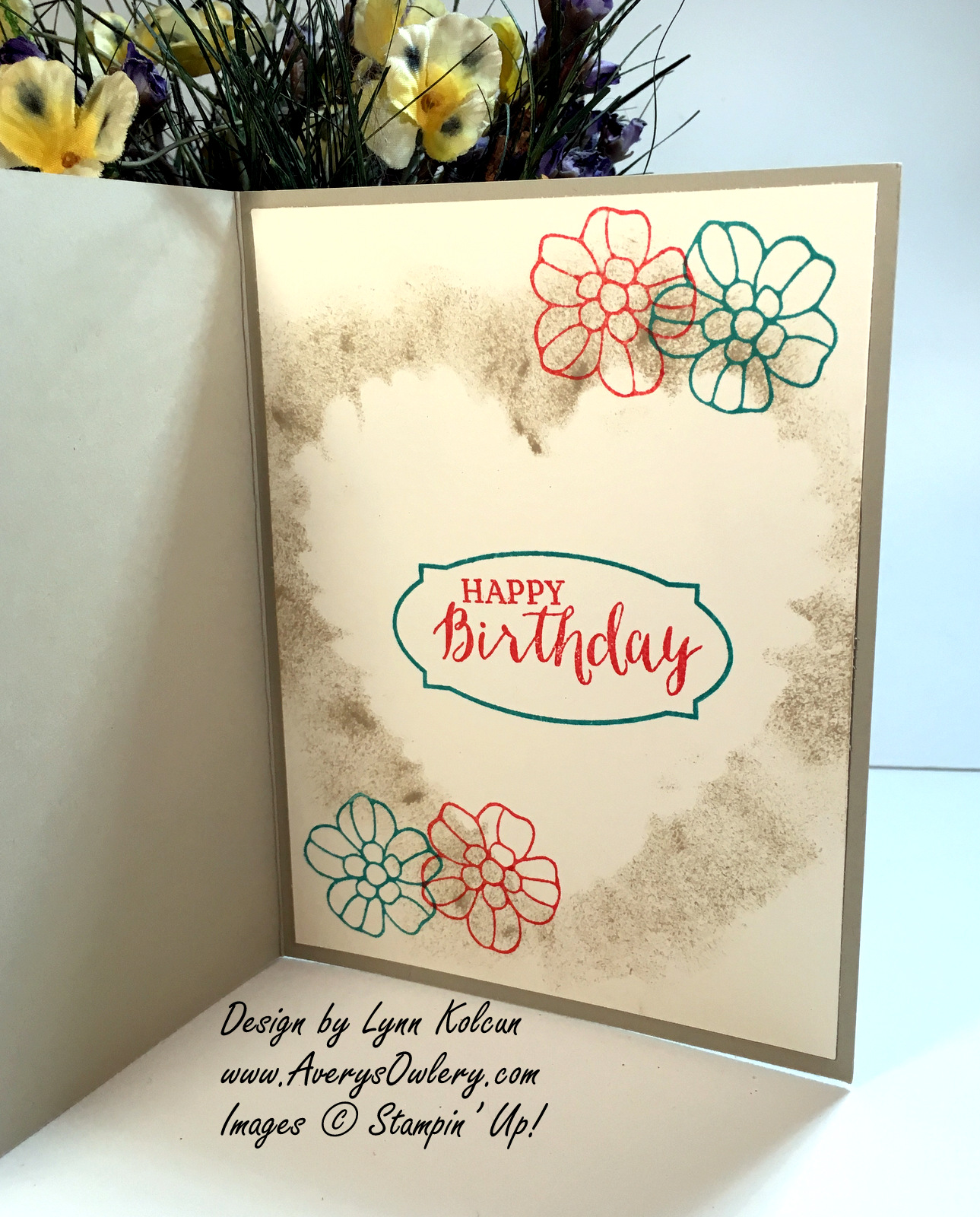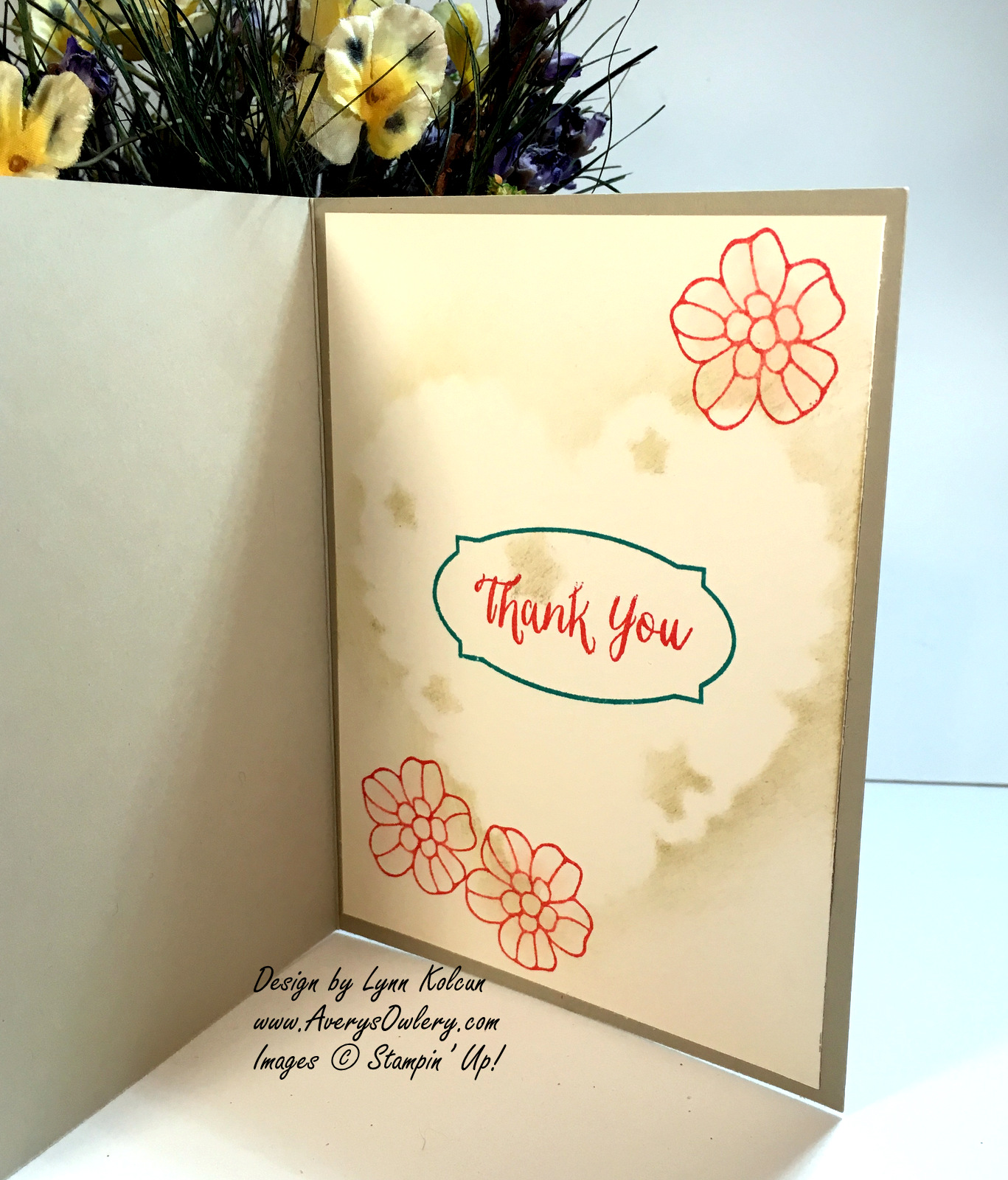 I find myself being a blog watcher. I check out certain bloggers in the Stamping Community looking forward to their projects every week. One of my favorites is Ann Schach at Stampinchic.com. Ann took a much needed break at the last part of 2015 and I for one missed her posts very much. That’s why I was so glad to see she is blogging and creating again. We all certainly benefit. Ann first posted this card on Jan 1, 2016. You can see her post Here. I loved it so much I cased it, and used it in one of my classes. Other than the color changes for the flowers, it’s pretty much her card, at least until you get to the inside.