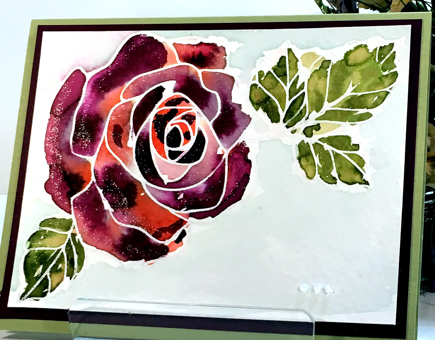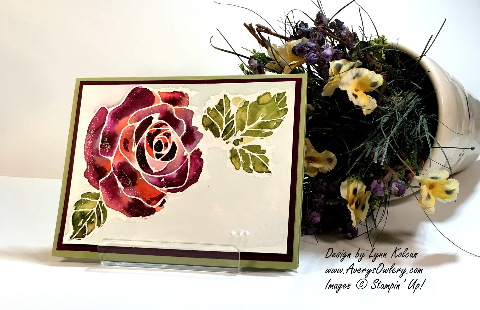I’ve been experimenting with all the new goodies I ordered in December from the Occasions Catalog. One of my favorites was the stamp set (with coordinating framelits bundle) Rose Wonder. For today’s card I used only the large rose stamp and my aqua pen with re-inkers. Here’s my card.