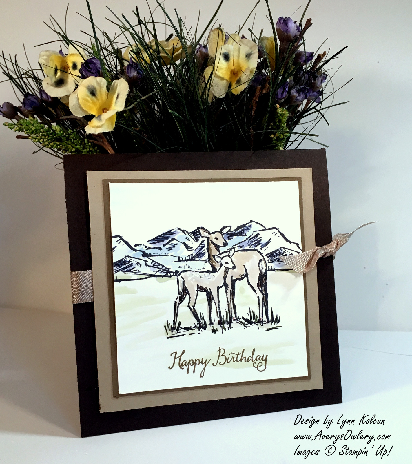 I stared by creating a mask for the deer image. I stamped it on a piece of post it note with the heads on the sticky end and carefully cut it out. (TIP – Save your masks in the stamp case for using another time. No need to cut it out again.) I stamped the image on my card stock then laid the mask over the image before stamping the mountain image. I used an aqua painter to add a little bit of color. The picture really doesn’t do it justice. I used soft suede for the deer and Night of Navy and Marina Mist for the mountains. Pear Pizzaz for the meadow and soft sky for the sky line. I also used my soft suede marker and basic black marker, the little ends, to add detail and shading for the deer. I also used my white gel pen on the back of the fawn and ears. The happy birthday sentiment is from Rose Garden stamp set. The finished size of this card is 5×5.