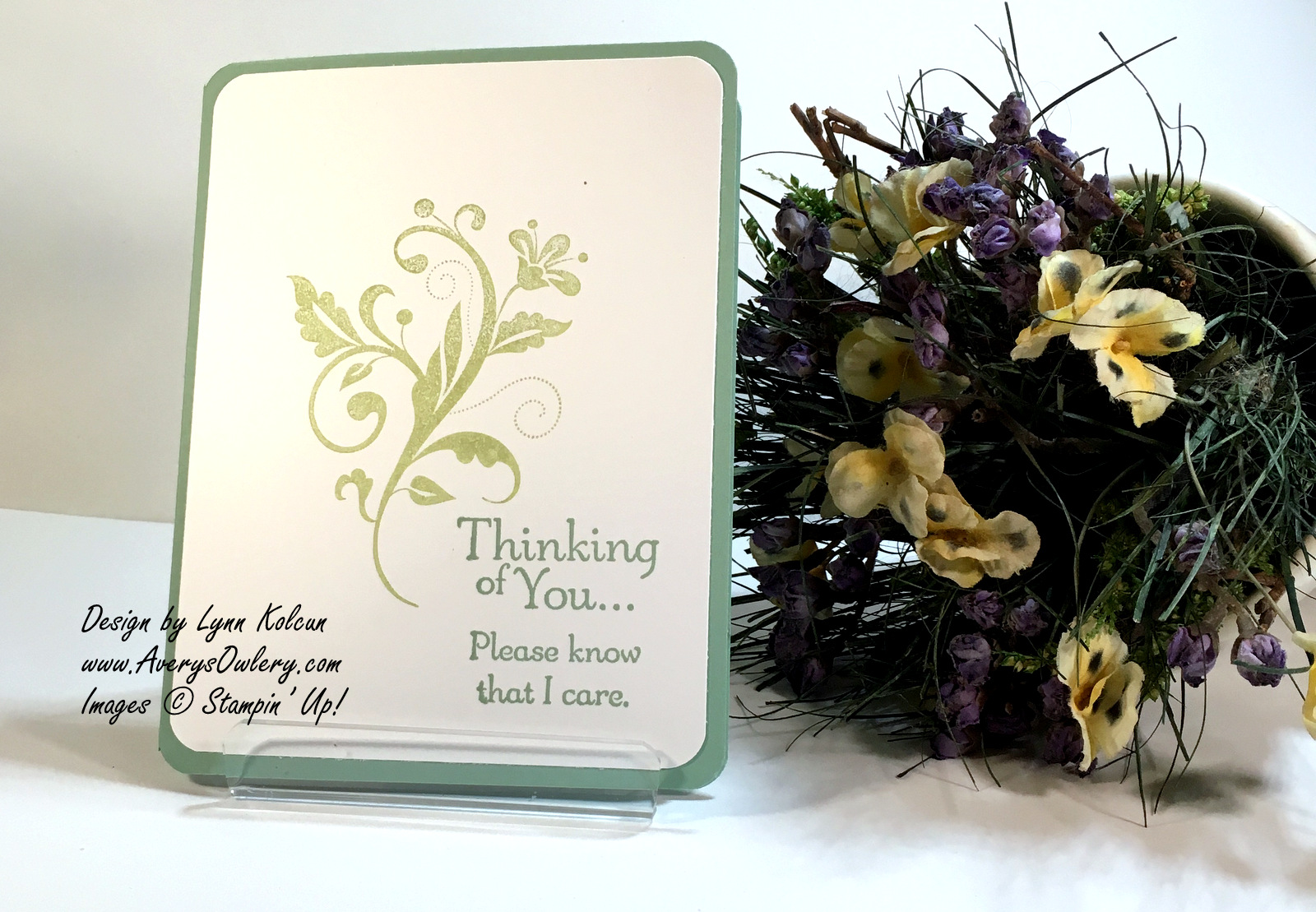 What attracted me about Mary’s card was the stamping, or what I thought was stamping, on window sheets. Mary actually used a rub on that Stampin Up doesn’t carry anymore. I liked the floating look of the image over the top of the ovals. I recreated it using Jet Black Stazon with Flowering Flourishes. One oval is on top of the window sheet with the Thinink of You from Teeny Tiny Wishes stamped in the middle. I used my paper piercing tool to place holes in the corners of the window sheet and the piece of whisper white underneath. I used silver brads to attch it.