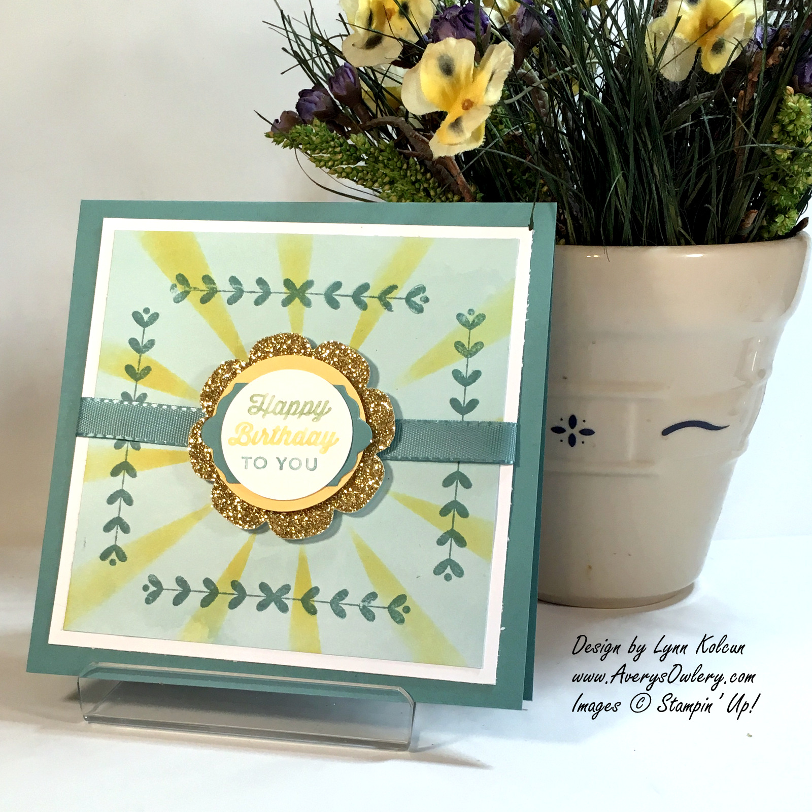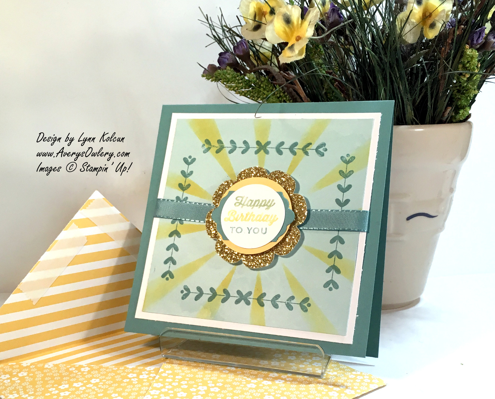 I love that I have so many choices with all the stamps, dies and colors. Today I used the Sunburst die along with the coordinating Sunburst Sayings Stamp Set for the initial inspiration of my card. I wanted a square card so I first cut the sunburst from card stock, then trimmed it so it was 4 x 4 square. I used this then as a mask on a piece of the free Sale-a-bration DSP Perfectly Artistic and sponged in the releif with Daffodil Delight.
