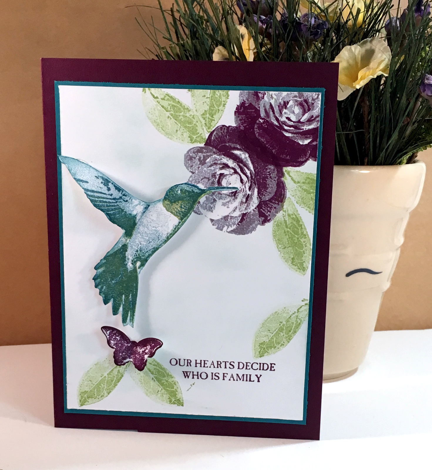 For the flowers, I used Wisteria Wonder as the base as it is the lightest shade. The second step I used Perfect Plum and for the final detail step, Blackberry Bliss. I used a different techniqe for the leaves. I only used Wild Wasabi but stamped it off on scratch paper twice before stamping on my card stock for the base layer. I stamped off once for the second level and the last most detailed stamp I used it full strength. The hummingbird is a three step also. I used Island Indigo full strength and stamped off once as well as Wild Wasabi. I really like these three colors together.