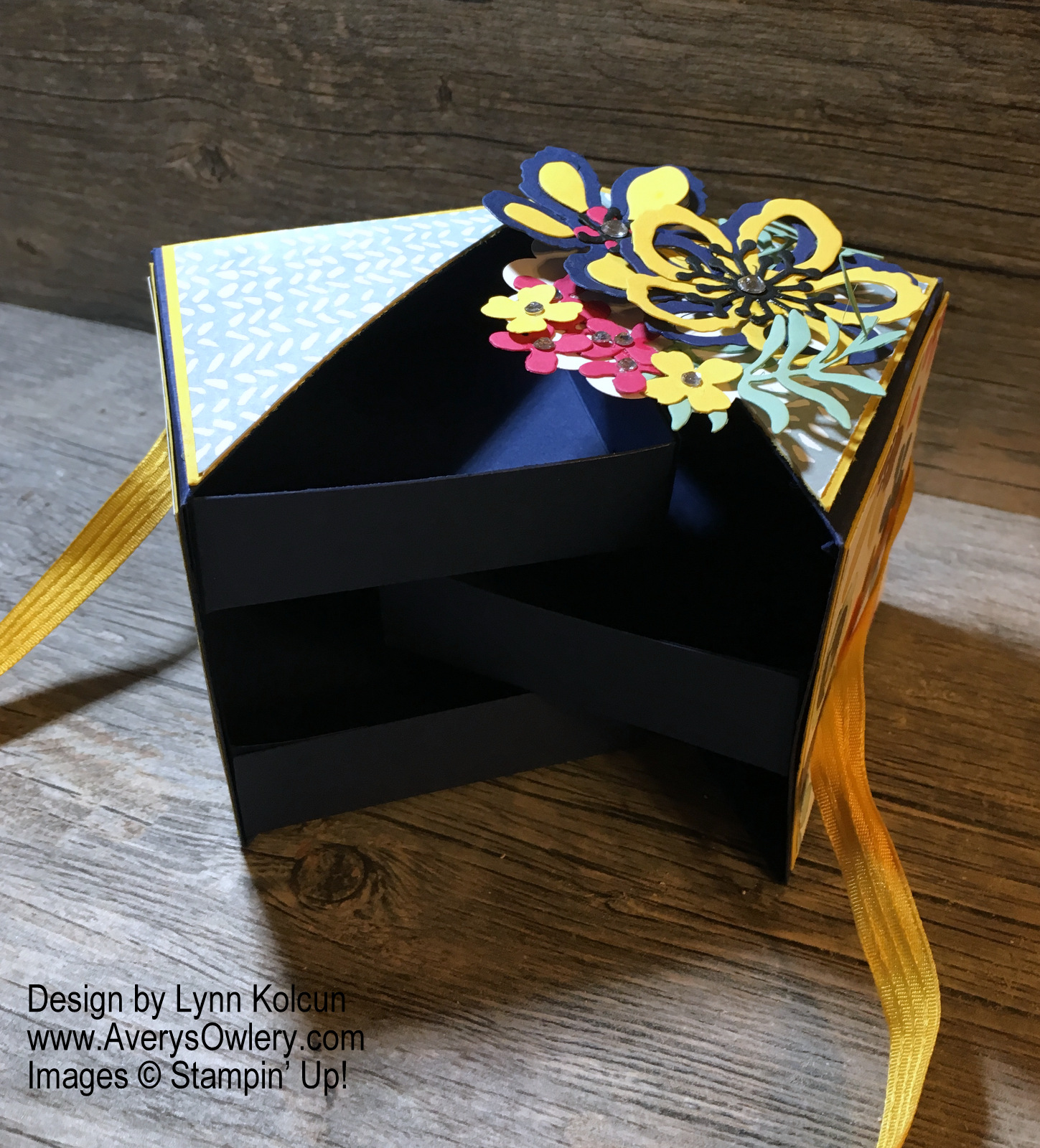 In the tutorial the secret box was made for Christmas but I opted for a more spring theme. I used English Garden Designer Series Paper and Botanical Bloom framelits in Daffodil Delight, Night of Navy, Mint Macaron as well as Mellon Mambo with the Itty Bitty Accent punch set flower. I used a Scalloped Circle punch to support all the flowers and attach to the box. Make sure to only attach on one side so the box will open to reveal the secret trays.