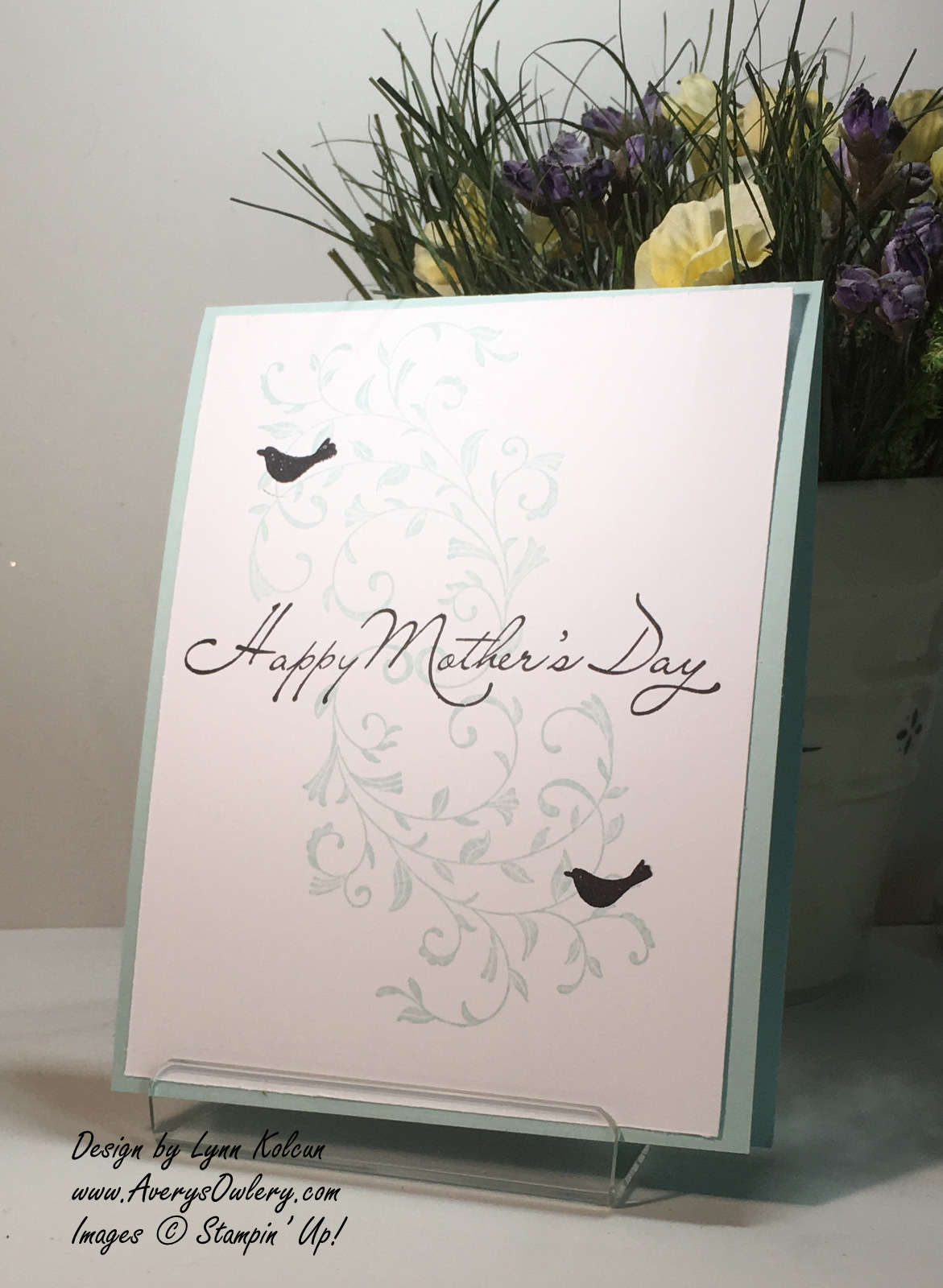 Don’t forget the inside: I again stamped the flourish with Soft Sky then added my Happy Mother’s Day stamp over the top with some of the birds in Basic Black. I picked up this Mother’s Day stamp many years ago at a big box store and I just love the script.