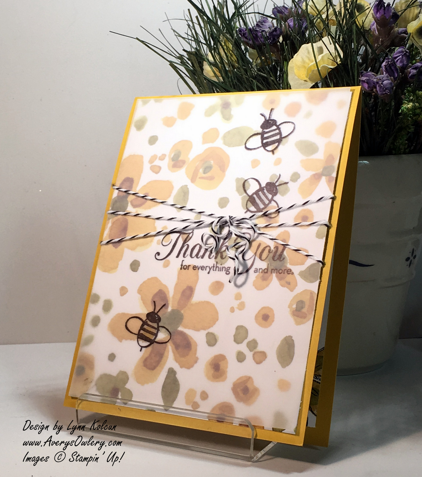 I don’t think a stamper can have enought stamps that say some version of Thank-You. One of my favorite Thank You stamp sets is One Big Meaning. Everything from single thank yous to groups, you can find it in that stamp set. I opted for bees instead of butterflys and because of that, I thought the black and white baker’s twine would bring out the stripes on the bee. I used the edge of my paper snips on the tail ends of the twine and curled it like a ribbon. To adhere the vellum to the card I strategically placed glue dots under the bees to hide them.