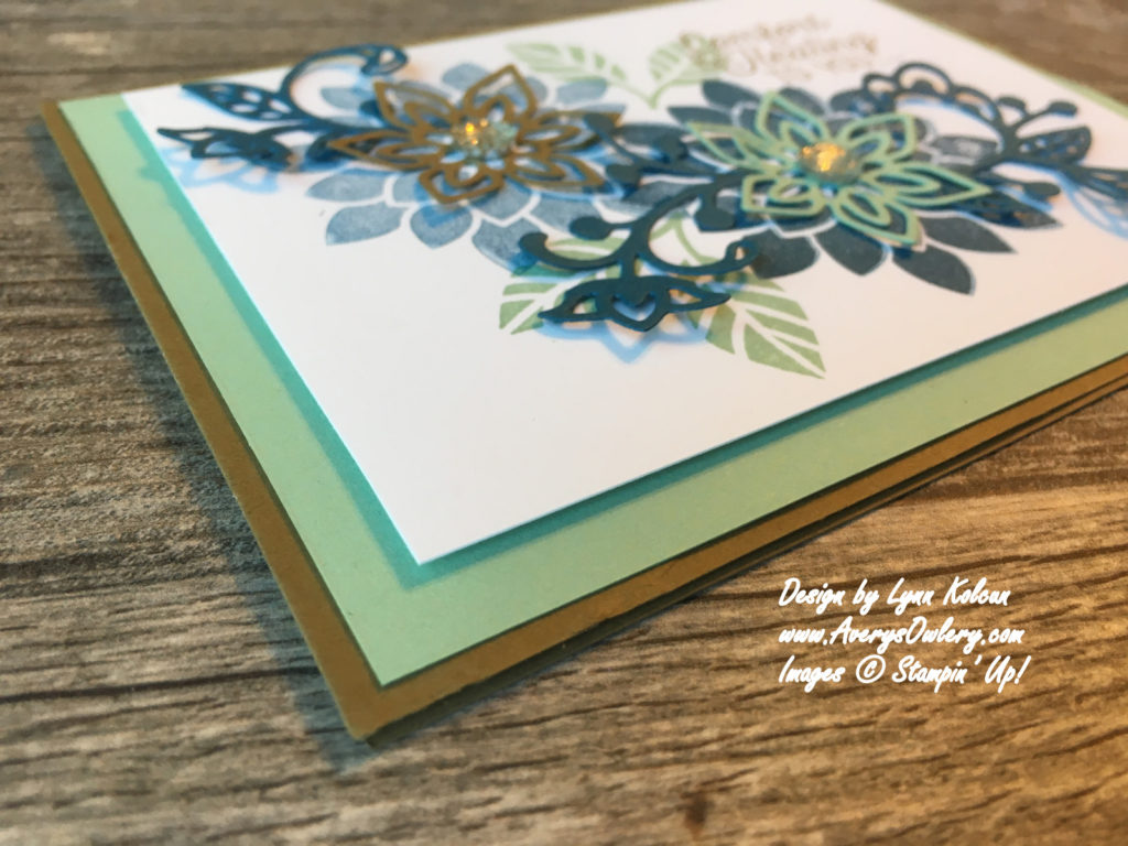 You might notice that I combined stamping and the thinlits. I started thinking I would use the large flourish from the die set along with some stamping underneath but I just didn’t like how it was coming together and I didn’t want to pull out another stamp set. So I started over. Twice. Finally I stamped the flower image using stamped off Dapper Denim once, then full strength. I added the Mint Macaron leaves and then the sentiment. I had already cut out two flowers from the die set so I added those on top of the stamped flower. Lastly, I took that great big flourish I had die cut from Denim and clipped it apart into three pieces and tucked them in around the flowers. Now that I liked. I topped the flowers off with some embellished rhinestones that I had left over from the Holiday Catalog. They were lost for a while, in a box…..then they were found. Might as well use them.