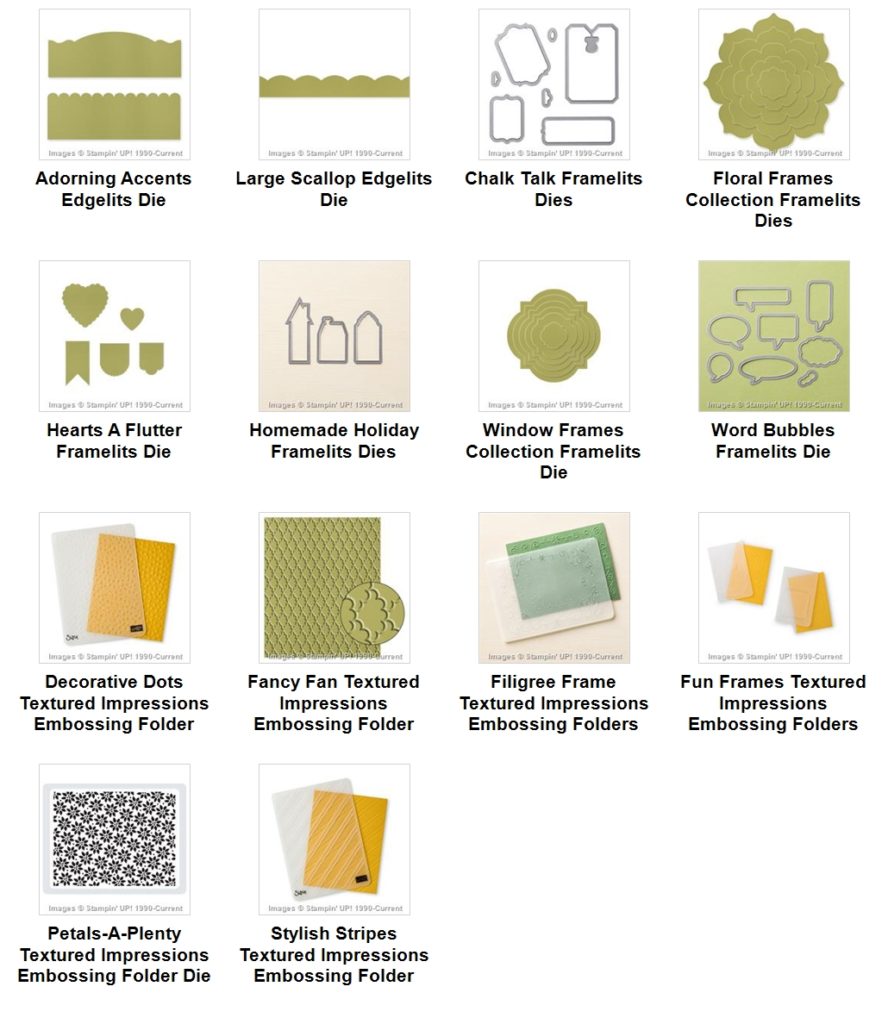 - All the framelits sets are $10.00. I’ve combined Adorning accents and the Large Scallop edgelits into one item.