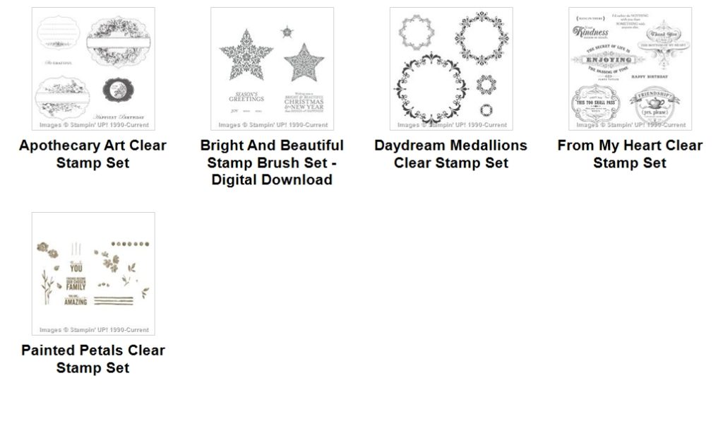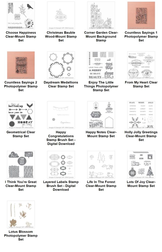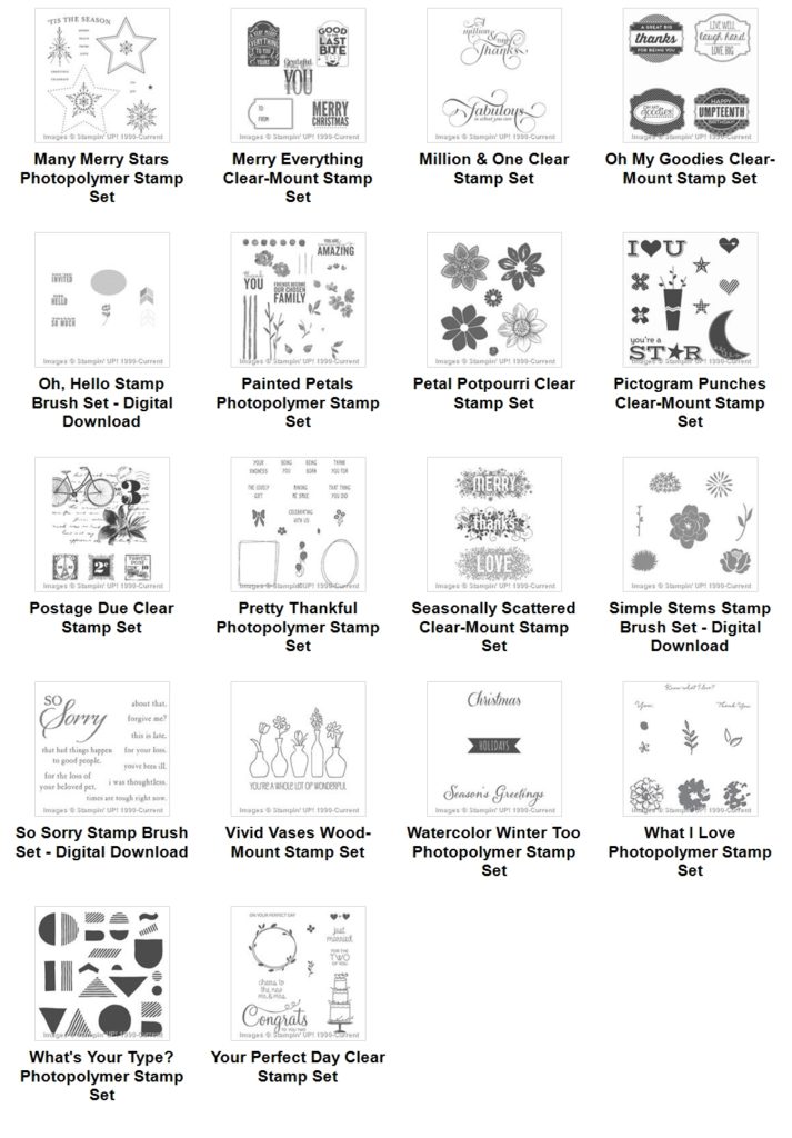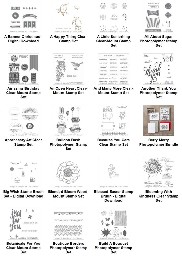 A few aren’t pictured, feel free to email me about those, but 98% of what I have left are pictured below. Pictures weren’t available for Best of Flowers, Gently Falling, Hooray It’s Your Day, Perfect Punches, Petite Sayings, Postage Collection, Winter Post, Wondrous Wishes, You’re Lovely.