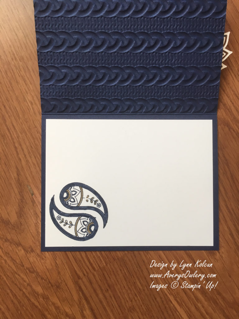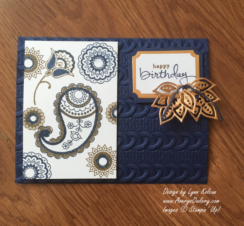 In the new Holiday Catalog, available for purchase September 1, there is a new set called Paisleys & Posies. The stamp set is full of great images of Paisleys and coordinates with a framelit set. I decided to use the stamps to create my own Designer Series Paper. I selected several of the images and stamped them in either Night of Navy or Soft Suede. I then colored in selected parts of them with those same colored markers.