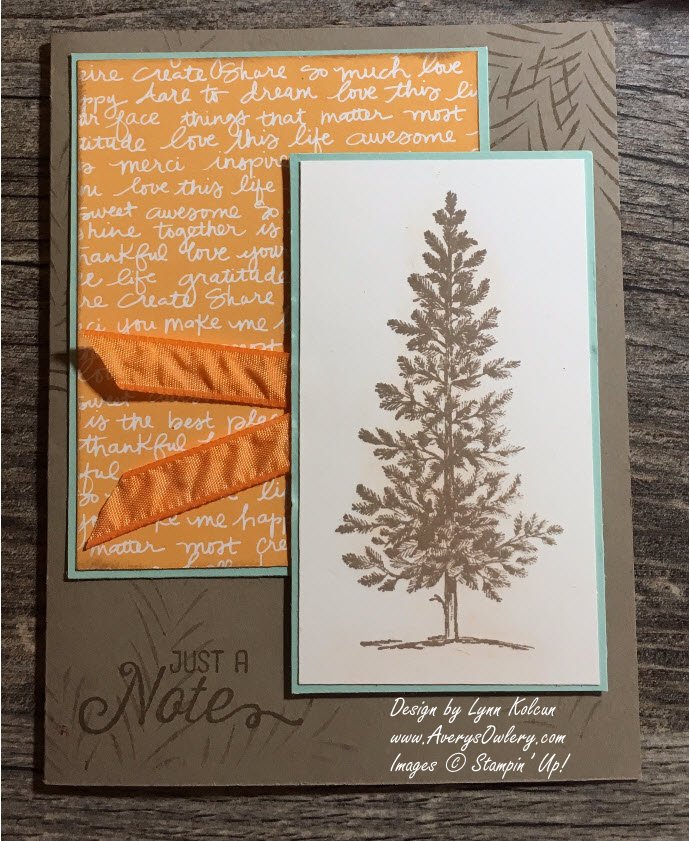 I decided to focus on the peekaboo peach and pool party with tip top taupe as the base. Since there aren’t any Designer series papers with exactly those three colors in it, I pulled out the In color paper stack for the words background paper. I sponged just a bit of tip top taupe around the edges to soften it. The tree is stamped with Taupe from Lovely as a tree. Both of these pieces have a thin mat of pool party. I wanted something on the card base and figured the pine branches from the Pretty Pines set would be the perfect accent, again stamped with tip top taupe.