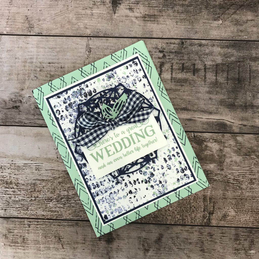 Is there a better color combination than blue and green. It is one of my favorites and I use it for lots of occasions. Today I’ve pulled it out for an upcoming wedding we are attending. With the ease of creating a background, some DSP and ribbon this card came together nicely.
