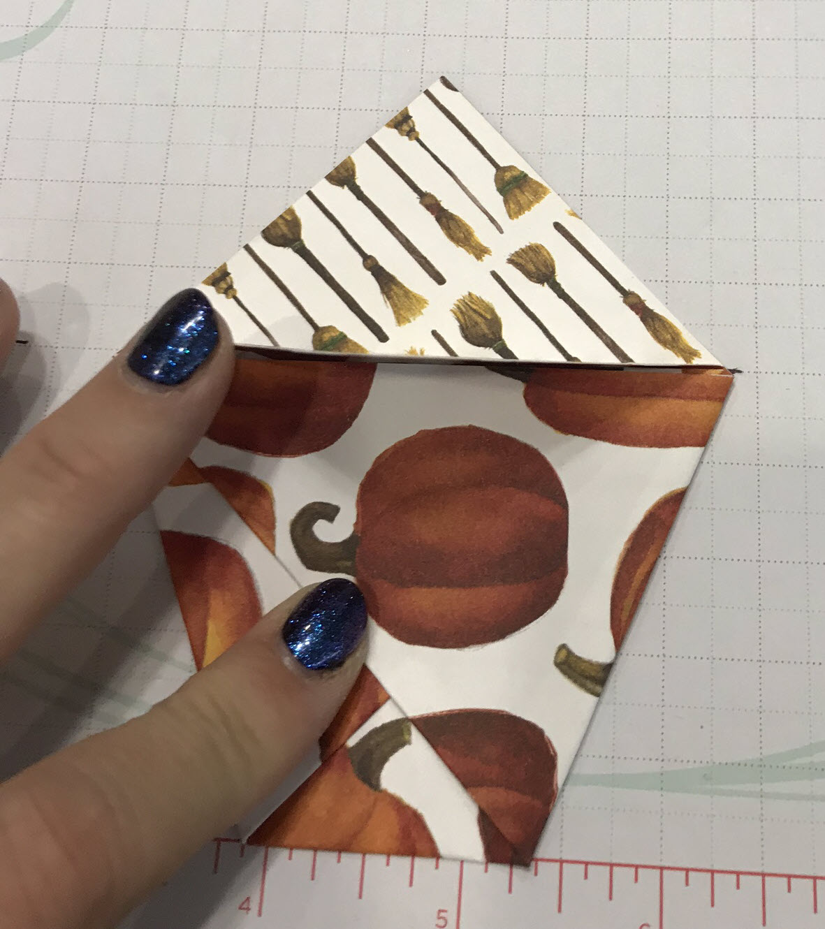 One my most favorite tried and true treat holders is also super easy. Called the Diaper Fold – cause it’s like folding a diaper – it takes only a 6×6 piece of patterned paper and some creative add ons.