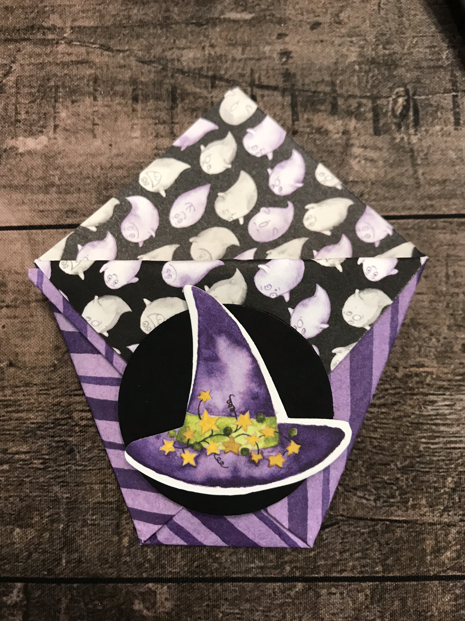 This is one of many I made for today’s post. I took advantage of the Toil and Trouble DSP and the Cauldron framelits that coordinate and actually cut out images of the DSP. Genius. Some have the Witches Hat, some the cauldron.