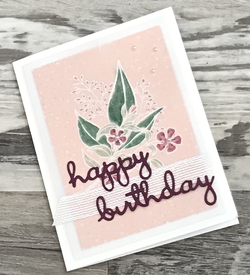 My card today certainly showcases Vellum. Did you know you can dry emboss vellum, die cut vellum stamp on vellum but my favorite, at least today, is to heat emboss on vellum. You have to be careful, and hold you’re heat gun further away than you might with paper. Also, keep it moving so as to not cause the vellum to melt.