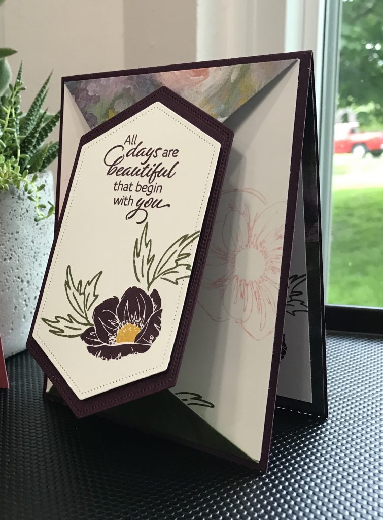 I first saw this design of card in the Pals Blog Hop on May 8th by Mary Hansen at Up North Stampin. You can see her original post HERE. A HUGE Thank you goes to to Jackie Bultje at the Pampered Stamper for her design of this fun fold called the Double Point card. Mary and I both used her video to learn how to make this card. Go HERE to see her video!