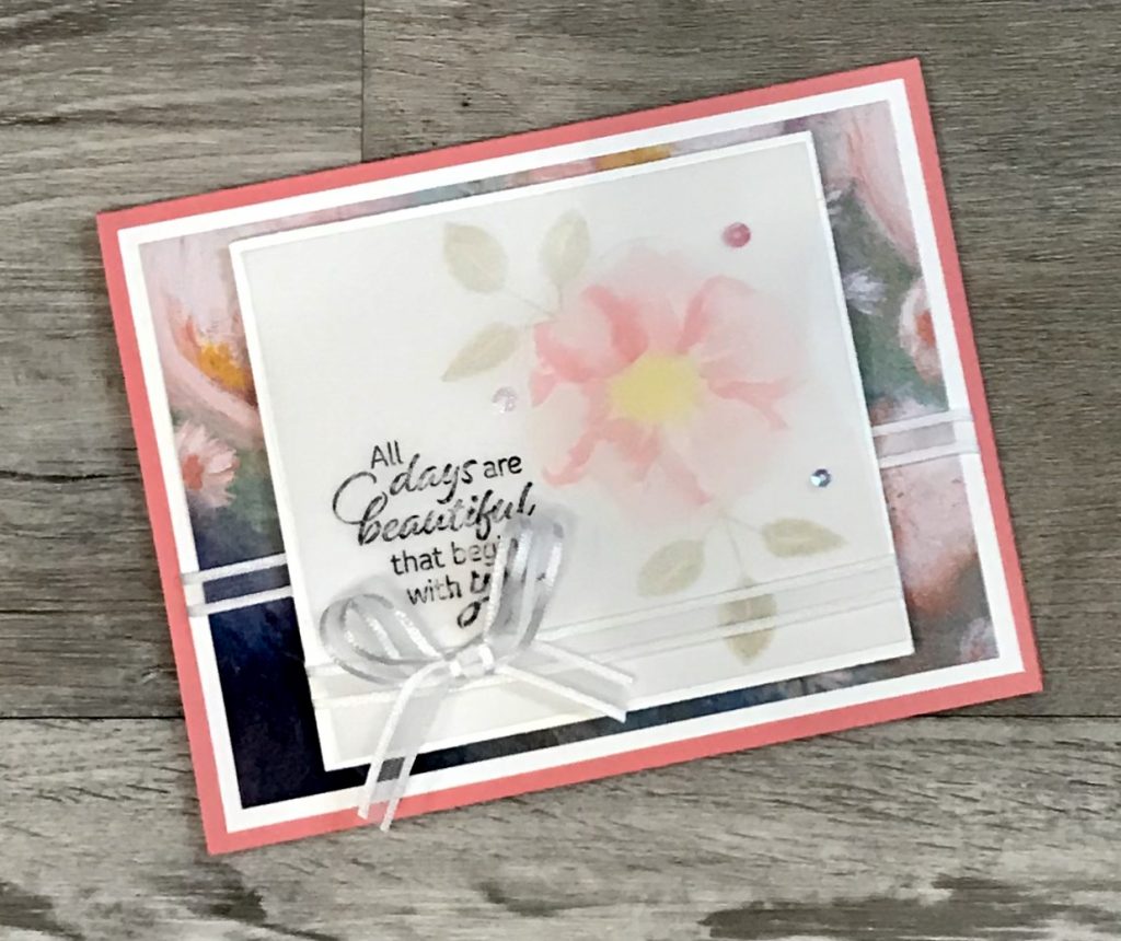 I stamped the large flower from the Floral Essence stamp set on vellum using Sahara Sand – stamped off twice. I water colored with Flirty Flamingo – lightly on the petals and more saturated on the edges. Daffodil delight for the center. I stamped the leaves with Sahara sand, also tamped off twice. I cut the vellum down to 3-3/4 x 3-3/8 with a whisper white layer underneath that is 3-7/8 x 3-1/2.