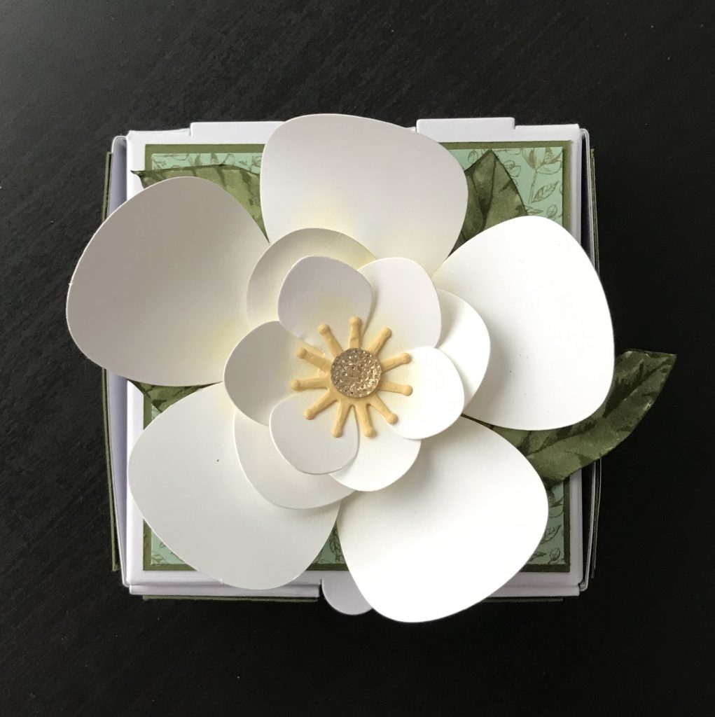 You’re back, great….essentially, the flower is just the same. 5 punches of the Hot Air Balloon punch, and one each of the petal dies from Magnolia Memory. However, I stamped out the large flower and leaf image from the stamp set, colored in the leaves, then snipped them out so I could place them more strategically on my mini pizza box. Of course after I finished snipping the final leaf I realized what a dummy I was and I could have used the big flower die and cut them out that way then just snipped the bottoms. But, I like that my leaves don’t have white around the edges because I snipped them tightly. I even ran the mossy meadow marker along the sides.