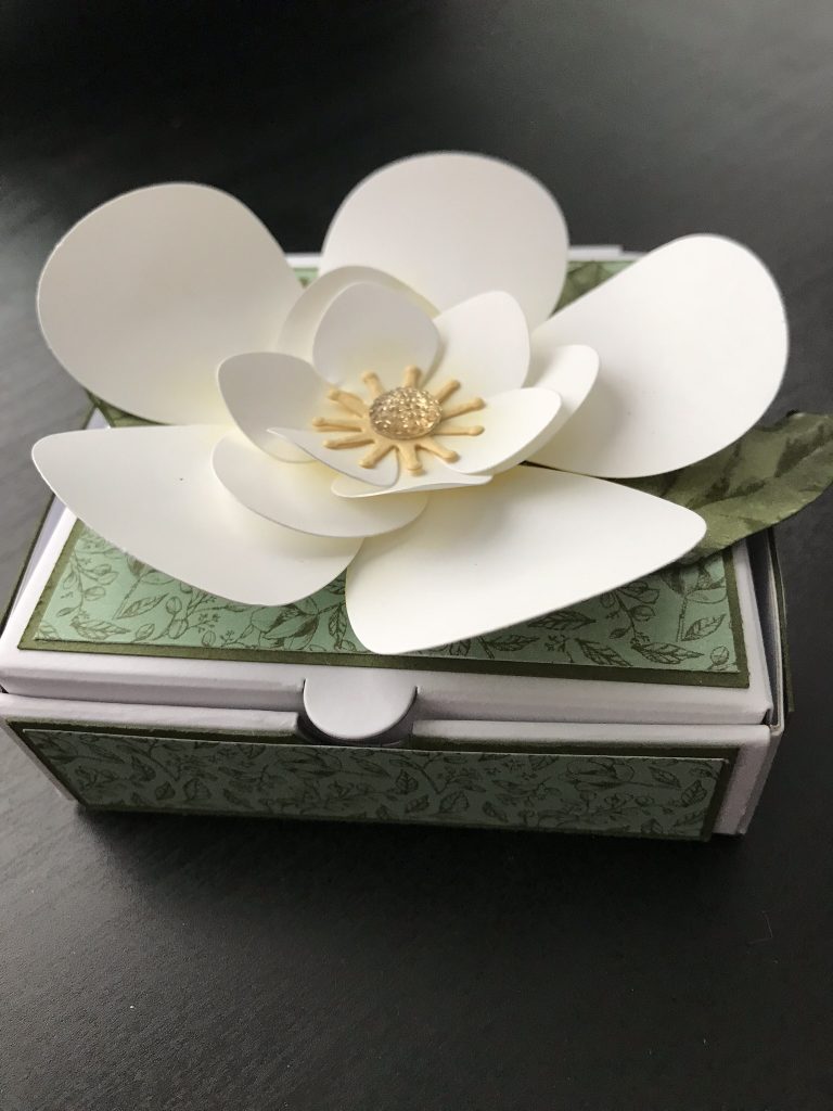 Isn’t that gorgeous. I made that beautiful magnolia flower with a punch and some dies. I followed along ALMOST exactly like the video here from Stampin Up. I’ll let you watch it then fill you in on what bits I changed.