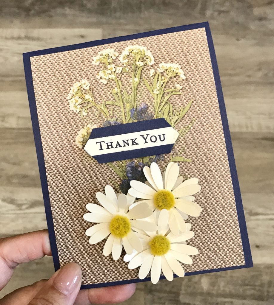 My card today just uses one piece as the background that had dried flowers and daisy’s . I added Daisy’s over the top for dimension.