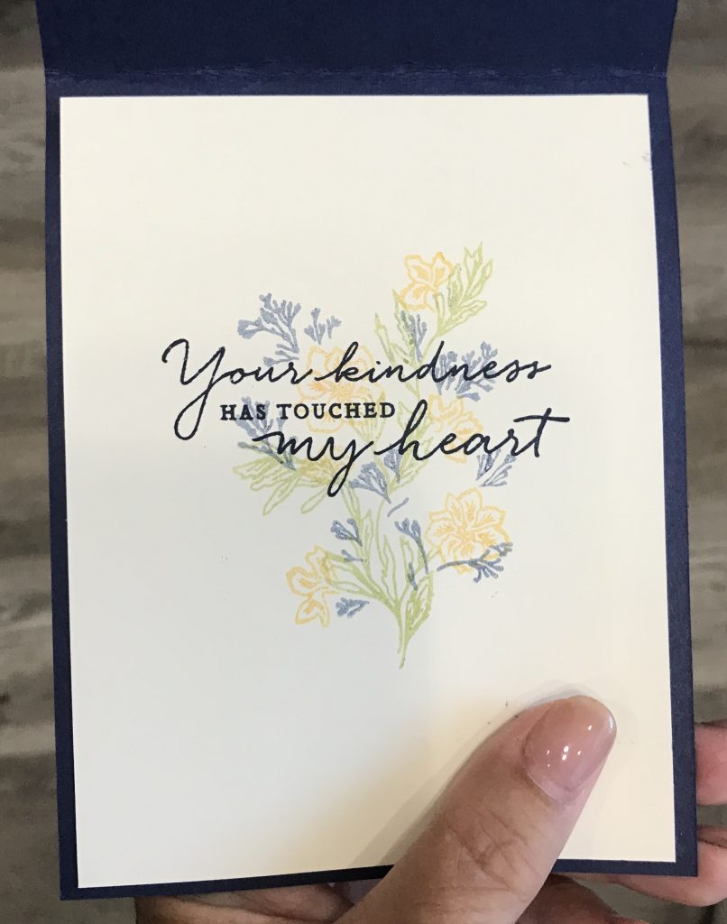 One of the best things about this stamp set is that it offers both outside and inside sentiments. I stamped the inside sentiment on Very Vanilla full strength in Night of Navy. The flowers and stems I stamped off once, sometimes twice, with Pear Pizzaz, Daffodil Delight and Night of Navy so it would be a nice background to the sentiment.