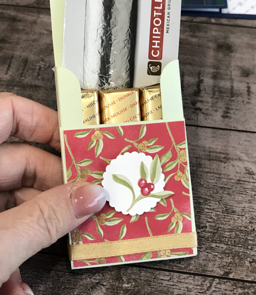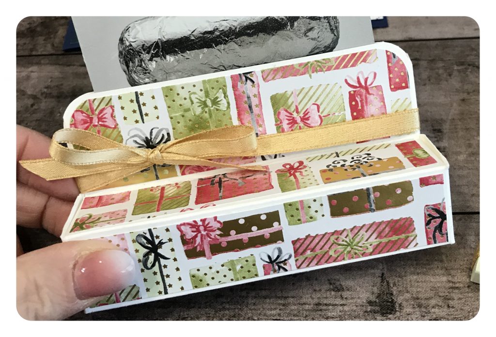 This is one of my favorites. Julie designed it to hold three Merci chocolates and a gift card. It is nice and solid and a pleasure to make and give, even better to receive. Here’s a video.