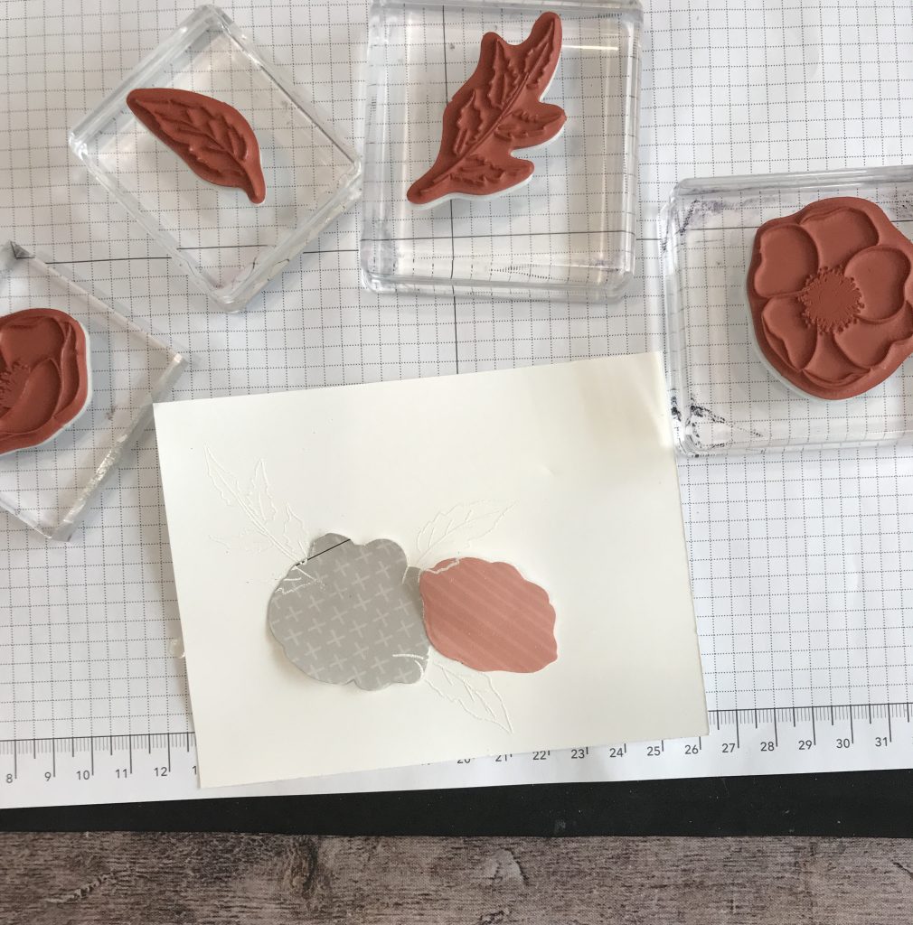 Working from the image I wanted to be ‘on top’ I stamped the large flower first with versamark then heat embossed with white powder on a piece of Whisper White. I laid the mask over the embossed flower and stamped the next flower. After it was embossed I laid a mask on it and stamped the leaves with versamark and heat embossed with white powder.