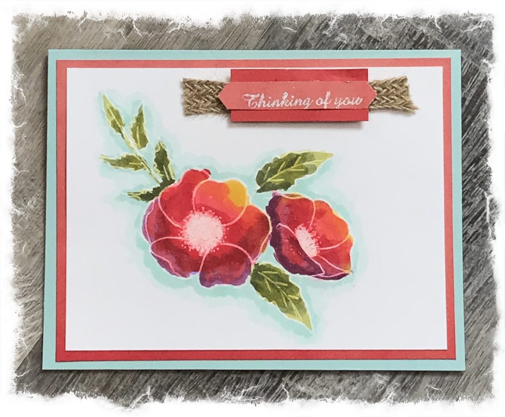 There are two stamp/die bundles, Peaceful Poppies Elements with watercolor, embossed and vellum accents and of course Ribbon. I’m starting with a project that shows off the Painted Poppie Stamp Set. Later posts I’ll share projects using other elements in the suite.